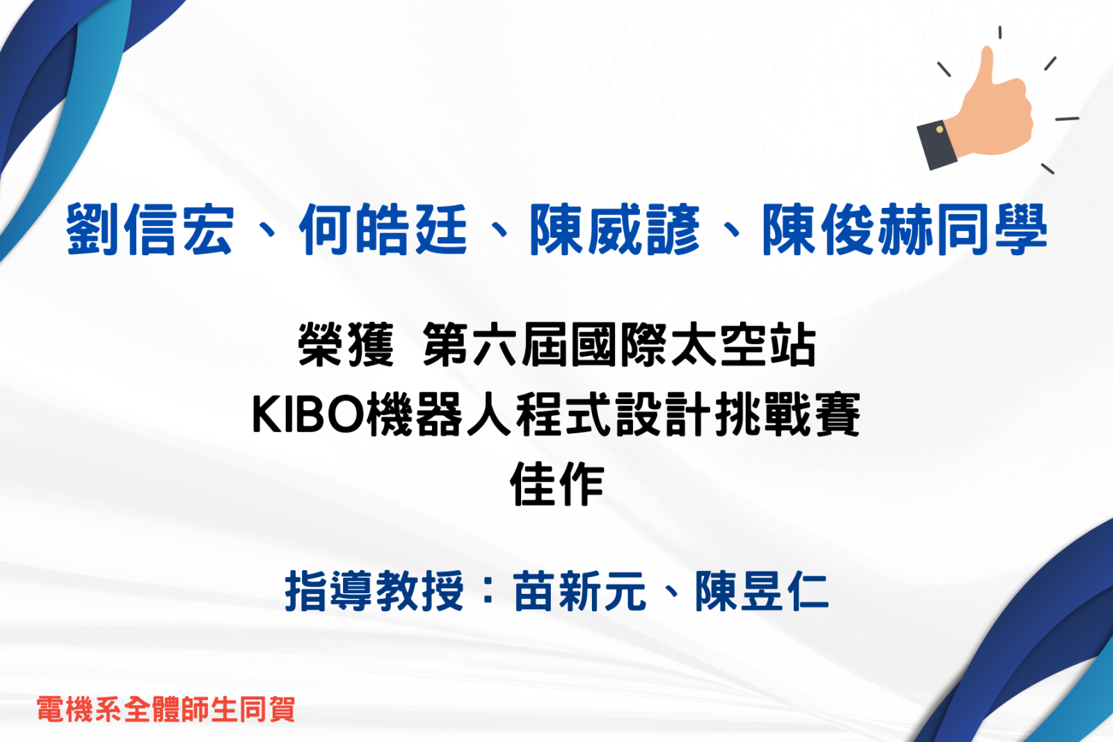 賀!本系苗新元老師、陳昱仁老師指導劉信宏、何皓廷、陳威諺、陳俊赫同學榮獲第六屆國際太空站KIBO機器人程式設計挑戰賽佳作