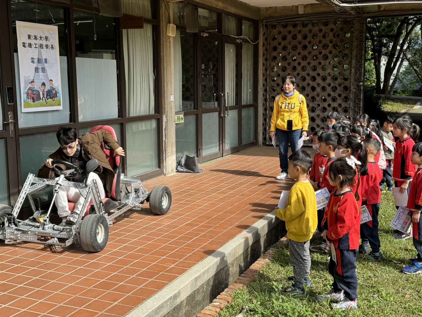 電動車體驗:由劉日新老師向小朋友們介紹「輪子、齒輪」最基本的應用,並結合最新的科技趨勢「電動車」的概念,小朋友們不僅能夠了解電動車的原理,還能實際乘坐駕駛模擬,體驗綠色出行的未來概念,從而提高他們對環保科技的興趣。