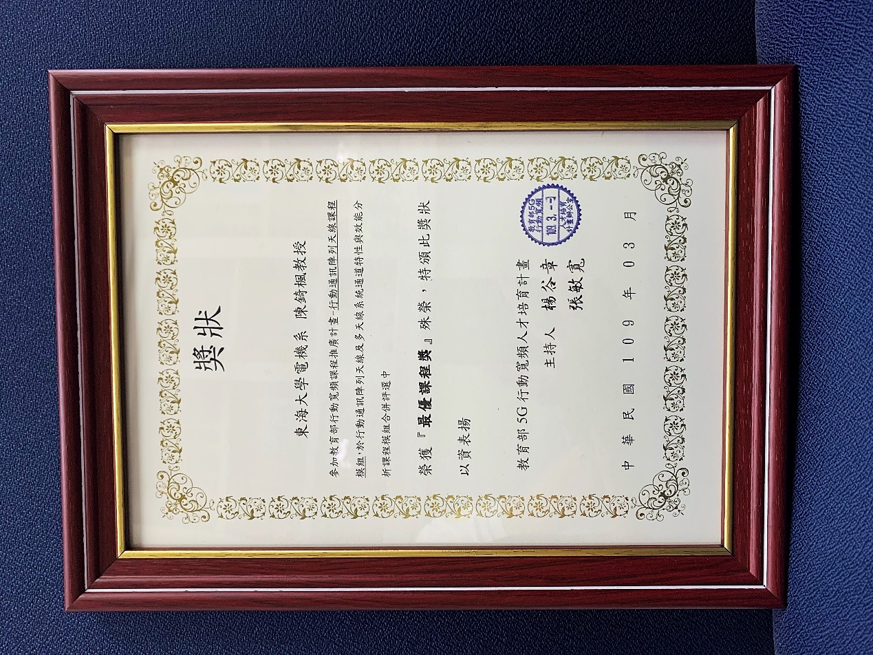 恭喜由本系陳錡楓教授擔任主持人之「天線理論」課程,榮獲教育部行動寬頻課程推廣計畫-行動通訊陣列天線課程模組之『最優課程獎』殊榮。