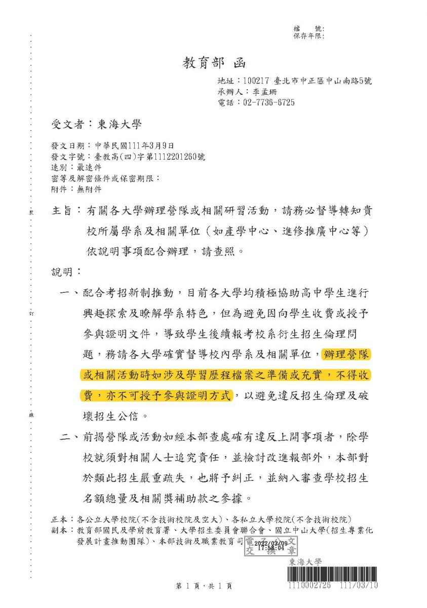 教育部來文-營隊或研習活動涉及學習歷程檔案不可授予証明