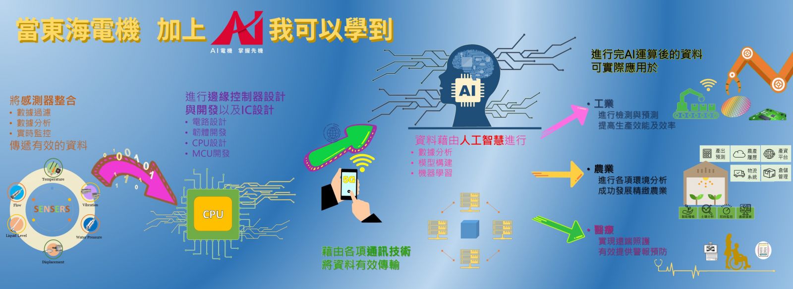 The Department of Electrical Engineering at Tunghai University aims to produce "high-tech professionals with humanistic qualities," distinguishing itself from other electrical engineering departments by not merely focusing on creating thoughtless machines.In terms of curriculum, the department centers around three main axes:Smart+,、Industry+,and Technology+.These serve as the focal points for development. The curriculum incorporates AI technology to deepen teaching and introduces industry resources to help students understand industry needs. The department provides students with courses that are both deep and broad, combining theory and hands-on experience. In addition to imparting specialized knowledge in the field of electrical engineering, there is a strong emphasis on cultivating students' abilities to think critically, innovate, and collaborate within a team. Through general education and minor courses, students develop a macroscopic perspective and a comprehensive international outlook. The Department of Electrical Engineering at Tunghai University is in close proximity to the Central Taiwan Science Park, Precision Machinery Technology Park, and Taichung Industrial Park, fostering a strong connection between faculty, students, and industries. With a well-structured curriculum and training, graduates are equipped with competitive skills for employment. The main pathways for graduates include further education, employment, overseas study, and entrepreneurship.