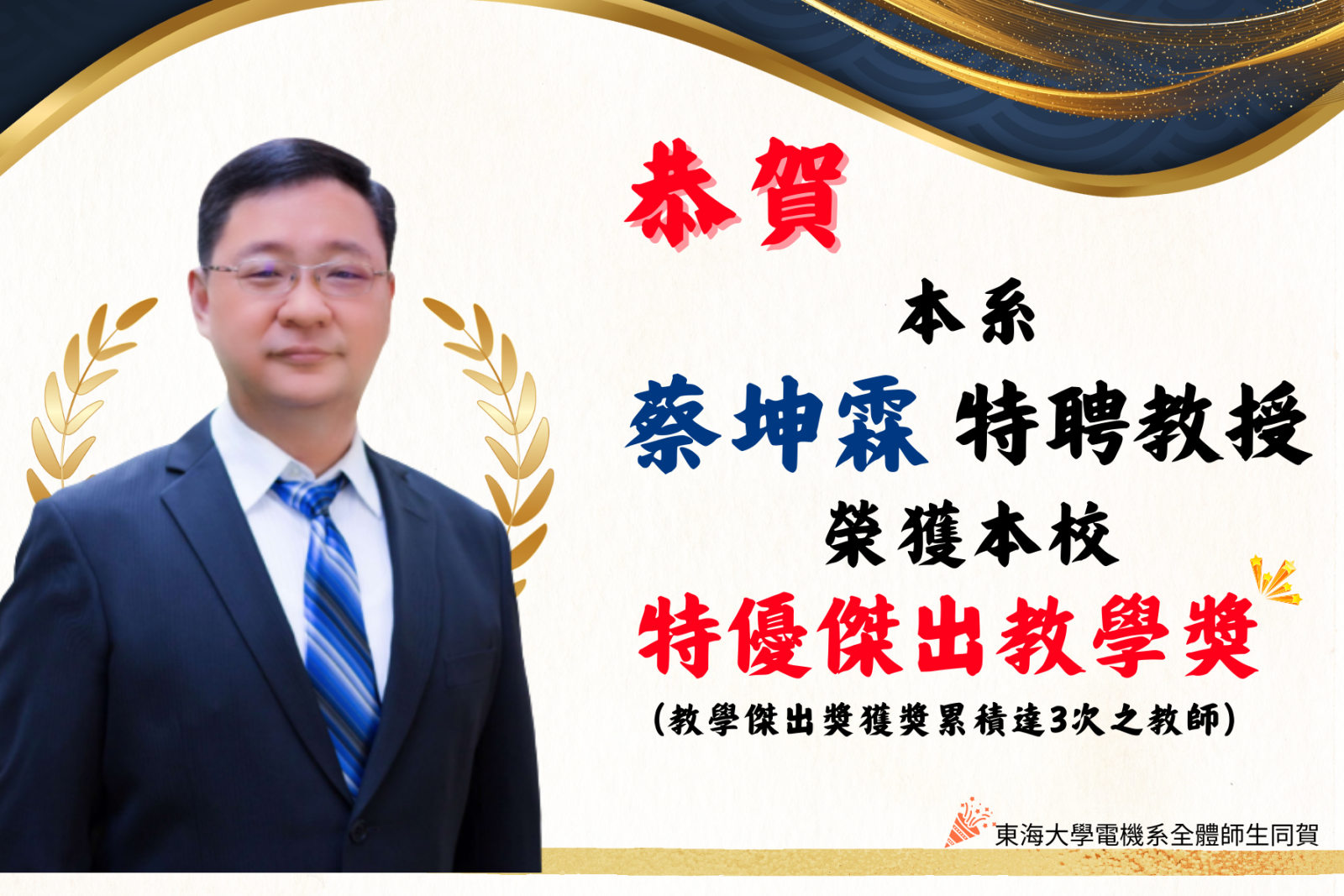 賀!本系蔡坤霖特聘教授榮獲本校特優傑出教學獎